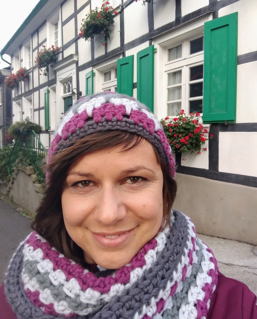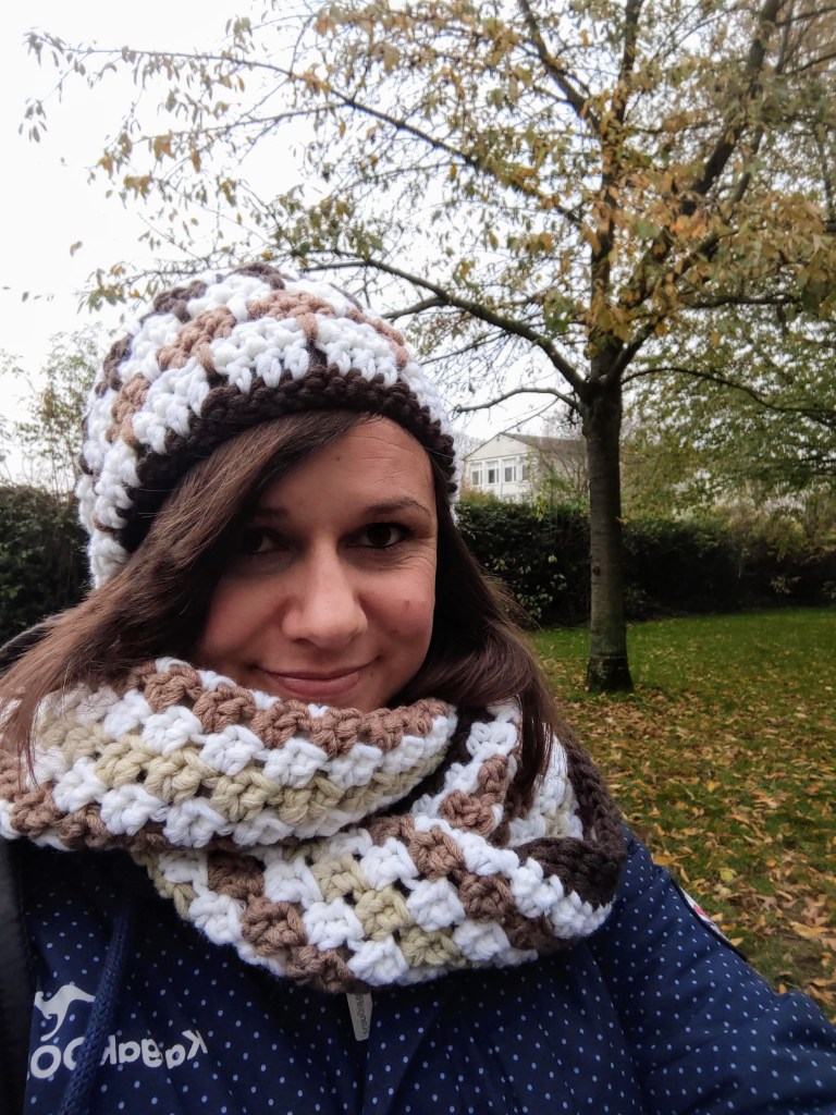 Die Loop-Schals bestehen aus 70% Polyacryl und zu 30% aus weicher Merinowolle. Ich hatte mir immer passend zu einer neuen Mütze einen Loop-Schal gemacht, das mache ich auch gerne für dich! 🙂